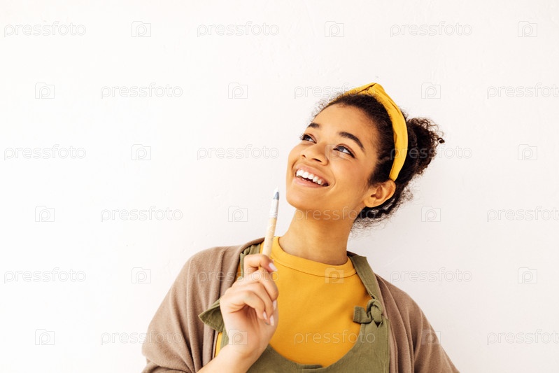 Очаровательная улыбающаяся африканская этническая художница, держащая кисть в руке