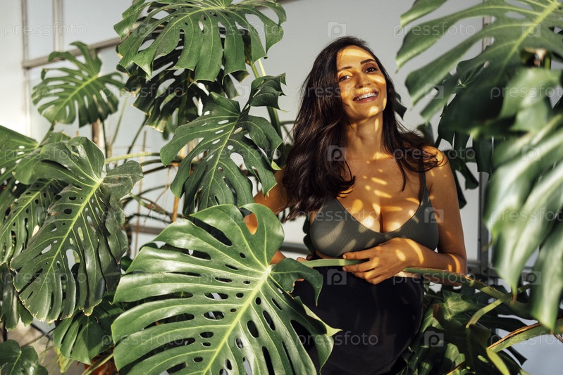 Красивая брюнетка, ожидающая ребенка, стоит в листьях монстеры