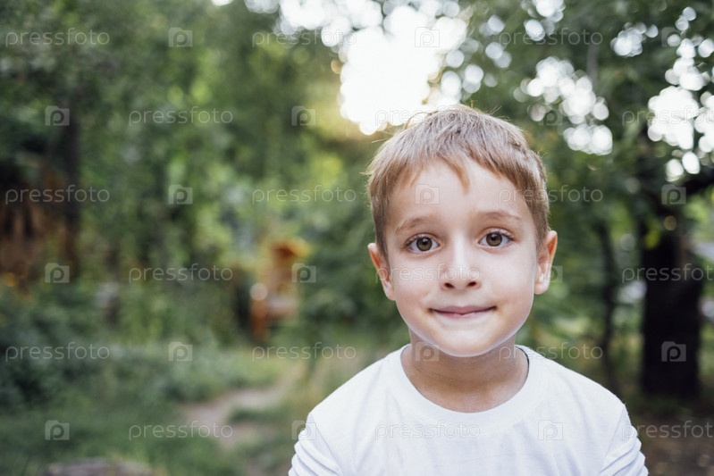 Закройте детский портрет милого маленького мальчика на открытом воздухе в саду