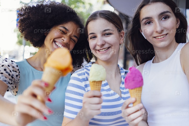 Три веселые многорасовые девочки-подростки держат красочное мороженое на улице на улице