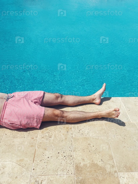 Молодой человек лежит у бассейна в курортном отеле во время отпуска. Крупным планом мужские ноги возле бирюзовой воды