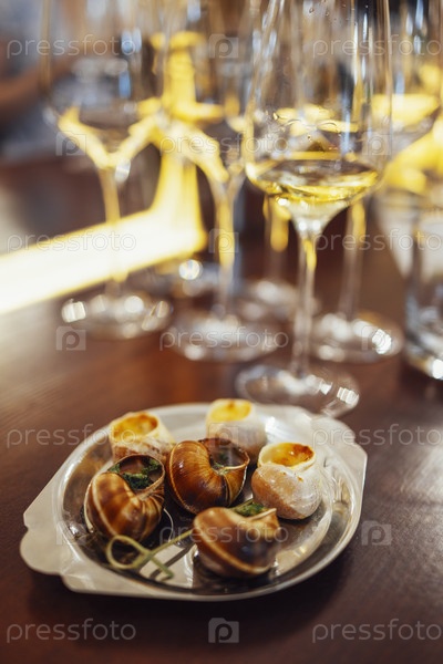 Изысканное лакомство из улиток на металлическом подносе. Улитка с травами на блюде на деревянном столе