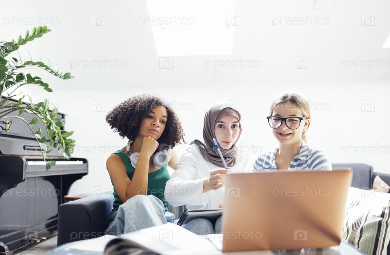 Три симпатичные девочки-подростка разных национальностей смотрят на экран ноутбука и смеются