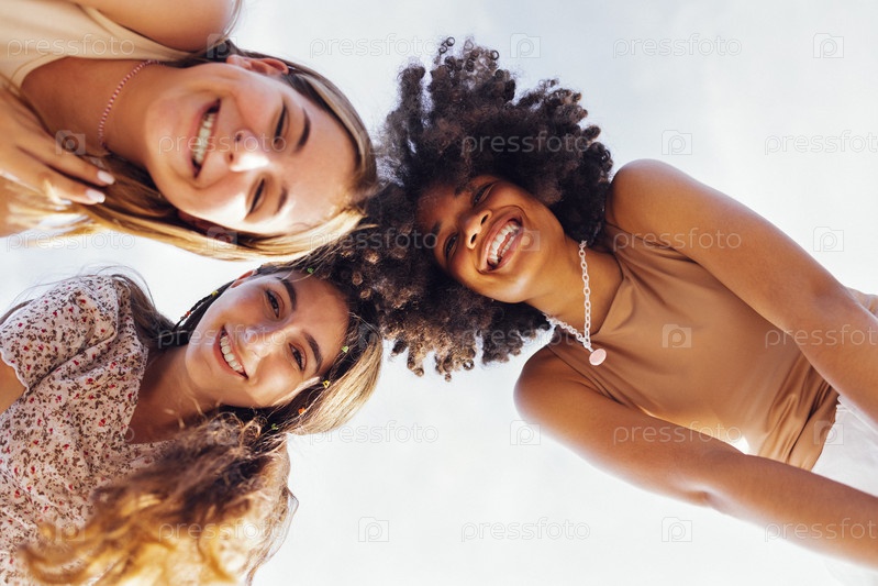 Смешные многорасовые улыбающиеся девочки-подростки стоят и смотрят в камеру