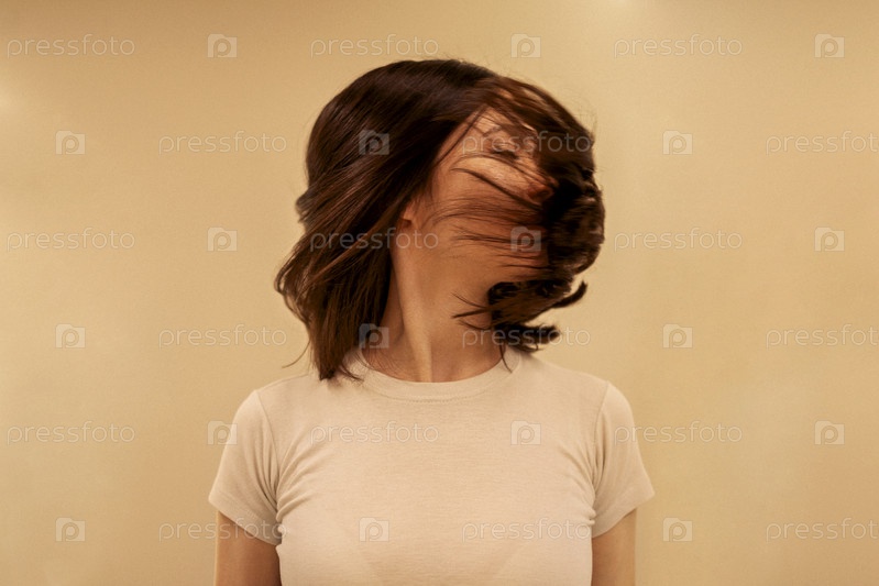Крупный план женского портрета привлекательной девушки поворачивает голову в сторону, а ее волосы развеваются