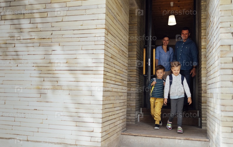 Молодые родители провожают своих милых детей в школу