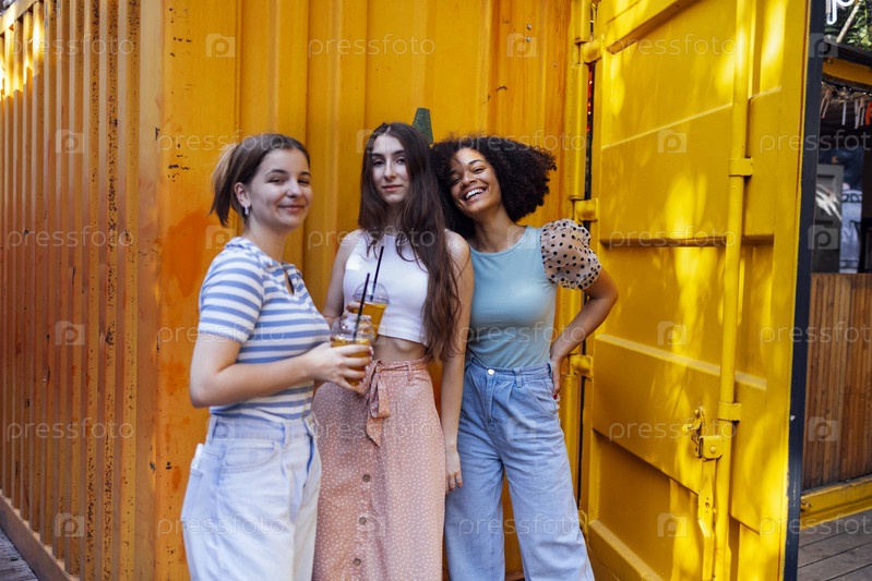 Три милые девочки-подростки в повседневной одежде на фоне цветного морского контейнера