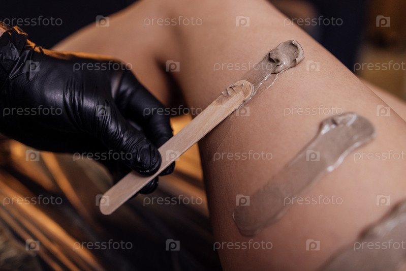 Массажистка наносит крем-скраб деревянной палочкой на ногу клиентки