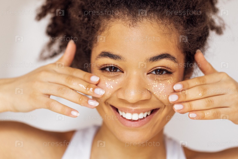 Крупный план портрета очаровательной афроамериканки, наносящей на щеки прозрачный блестящий гель