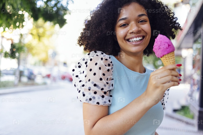 Улыбающаяся милая девушка смешанной расы идет по улице и держит розовое мороженое