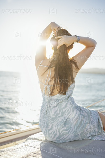 Молодая женщина в красивом элегантном сарафане сидит на палубе корабля и встречает восход солнца