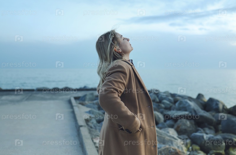Молодая женщина в повседневной одежде и пальто бежит по берегу моря