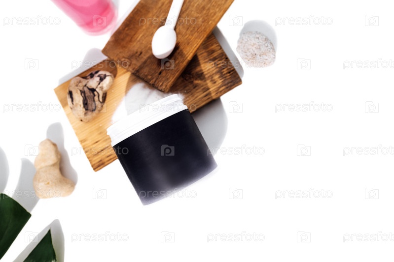 Макет пластиковой банки для порошка коллагена. Ложка с коллагеном на деревянных подмостках, стеклянная чашка и лист монстера