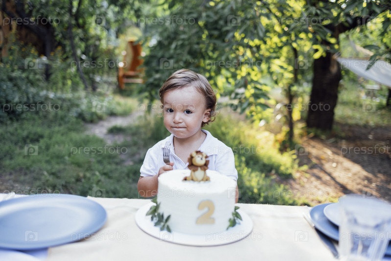 Милый малыш с волнистыми светлыми волосами и белой рубашкой сидит за столом возле праздничного торта на открытом воздухе
