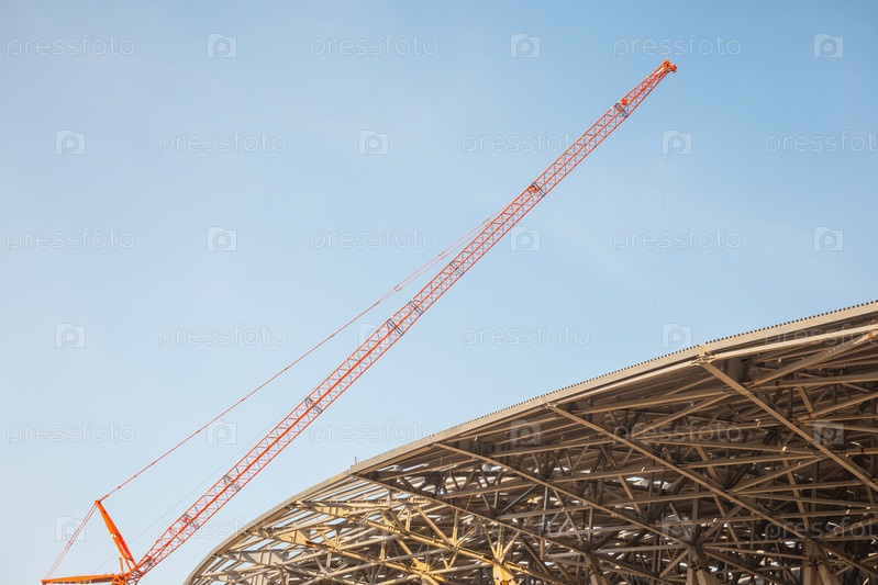 Строительная площадка. Строительные краны и строящееся здание на фоне голубого неба