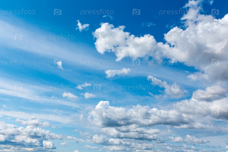 Белые облака на летнем голубом небе в мультяшном стиле для фона или дизайна обоев. Белизна круглых облаков на голубом небе. Высокие облака в небе