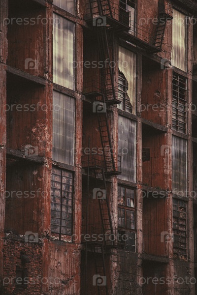Задняя сторона заброшенного кирпичного многоквартирного дома на Манхэттене, демонстрирующая городской упадок