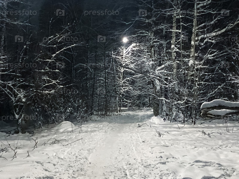 Снежная дорожка между рядами заснеженных деревьев, освещенная светом фонарей