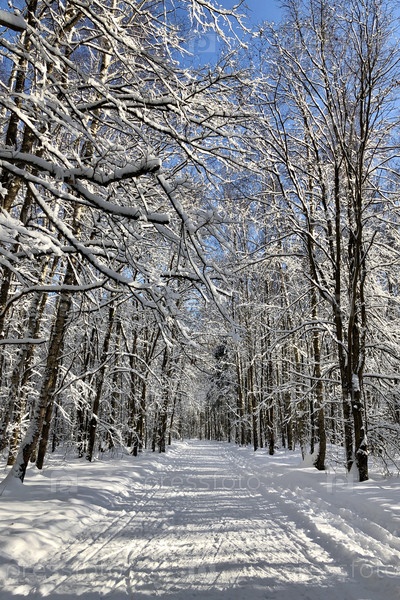 Проселочная зимняя дорога через лес среди заснеженных деревьев