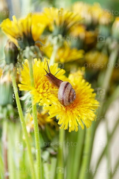 Маленькая улитка ползает по желтому цветку одуванчика