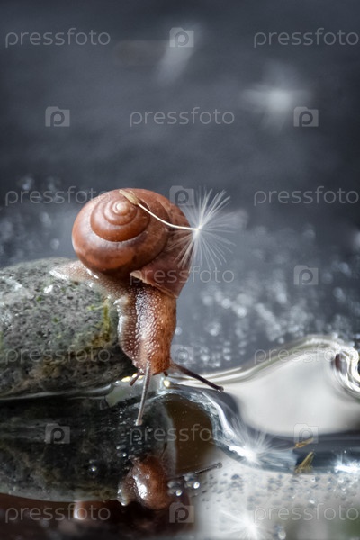 Милая маленькая улитка с семенем одуванчика на раковине сидит на большом камне и смотрит в зеркало воды