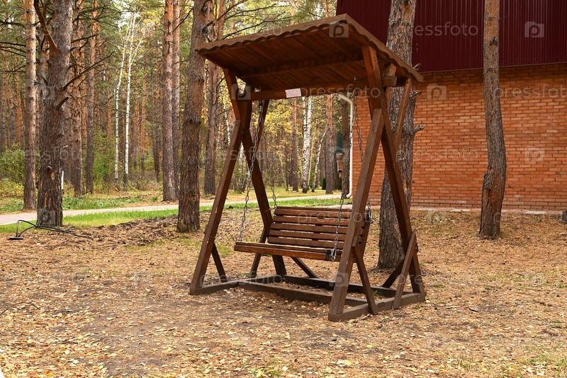 Деревянные качели в осеннем лесу. Концепция отдыха. Осенний пейзаж