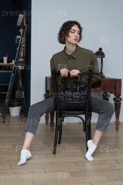Молодая красивая женщина сидит на стуле в зеленой рубашке в студии
