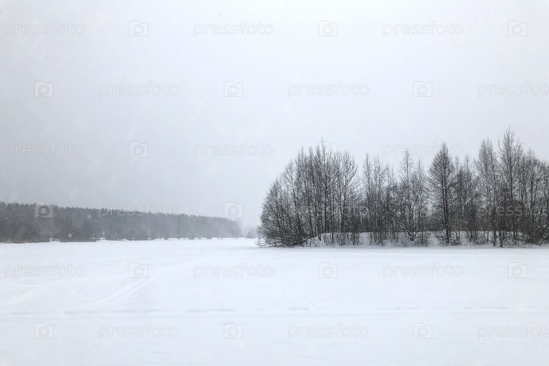 Маленький остров с голыми деревьями посреди заснеженного озера во время снегопада зимний минималистичный пейзаж