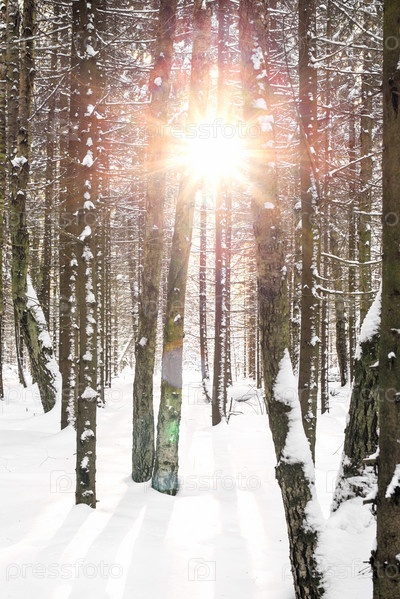 Солнечный свет пробивается сквозь стволы деревьев в зимнем лесу