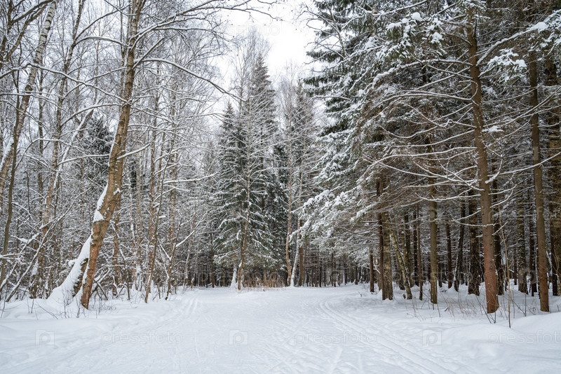 Заснеженная тропа в зимнем лесу с лыжными трассами