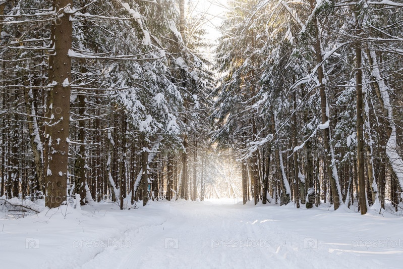 Лыжные трассы на заснеженной дороге в сосновом лесу в солнечный зимний день