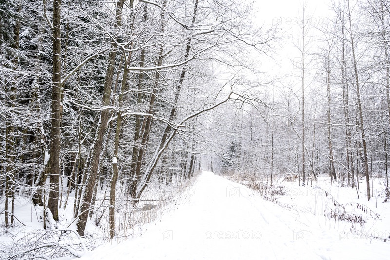 Заснеженная дорога в парке среди голых безлистных деревьев зимний пейзаж