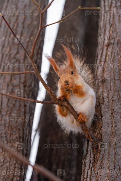 Милая белка ест орех, сидя на дереве в зимнем парке