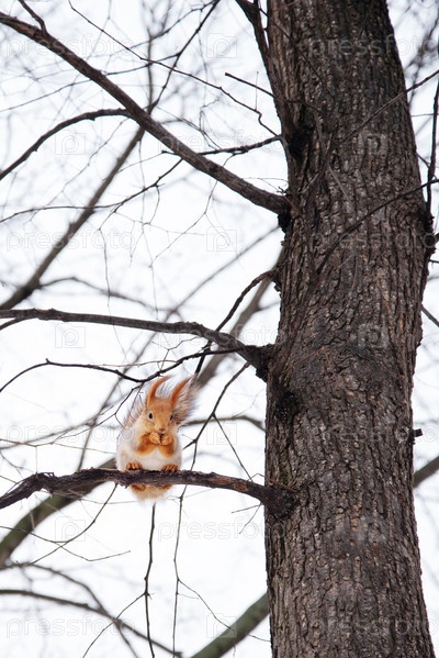 Милая белка ест орех, сидя на дереве в зимнем парке