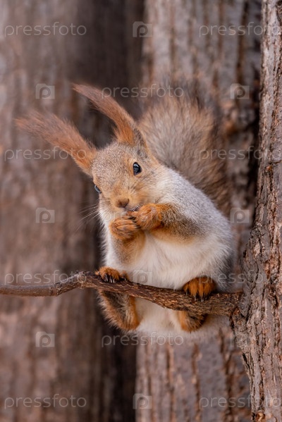 Милая белка ест орех, сидя на дереве в зимнем парке