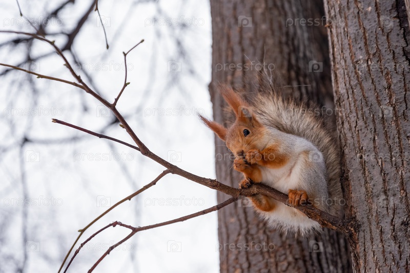 Милая белка ест орех, сидя на дереве в зимнем парке