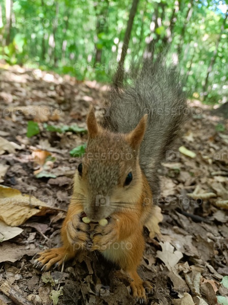 Бельчонок в лесу сидит на задних лапках и держит орех грецкий