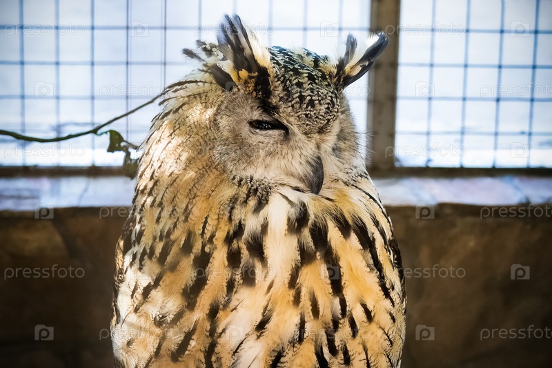 Филин в вольере в зоопарке, портрет