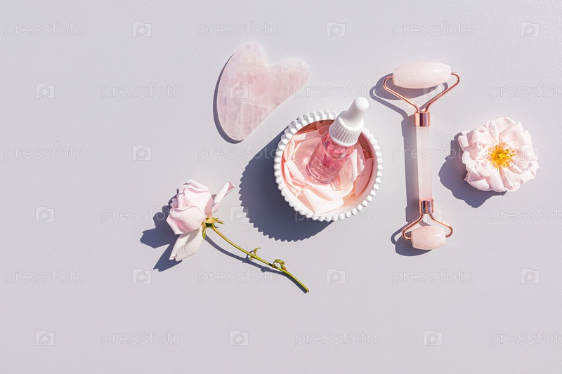 Прозрачный флакон с косметическим продуктом с сывороткой или розовым маслом лежит в миске с лепестками роз, кварцевым массажером, скребком гуаша. Вид сверху