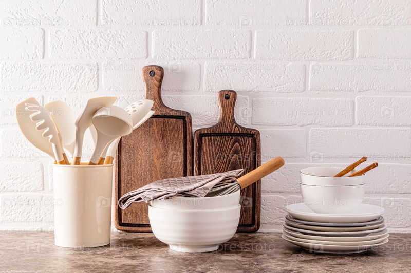 Стильный современный кухонный фон. Экологически чистые предметы и посуда на столешнице из темного мрамора в интерьере уютной кухни