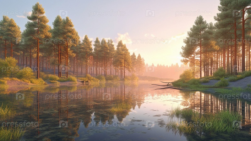 Красочная иллюстрация с пейзажем лесного озера