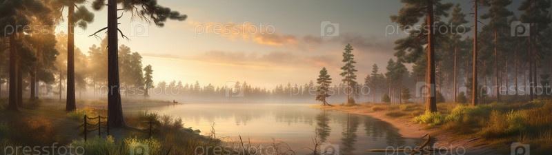Красочная иллюстрация с пейзажем лесного озера