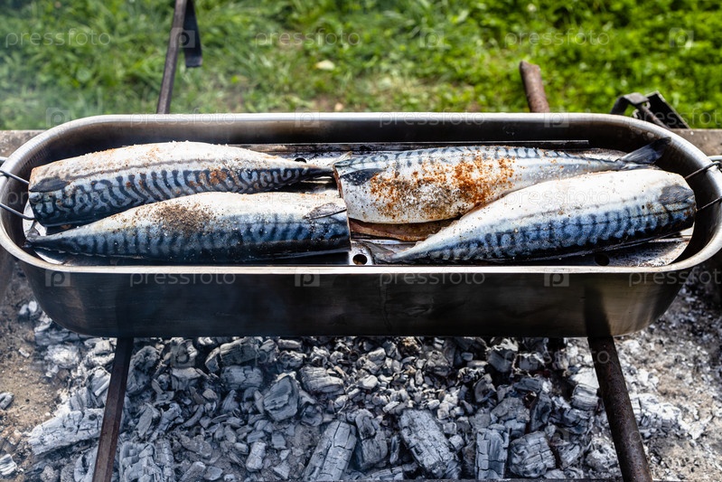 Сырая рыба в стальном котелке для курения на открытом гриле