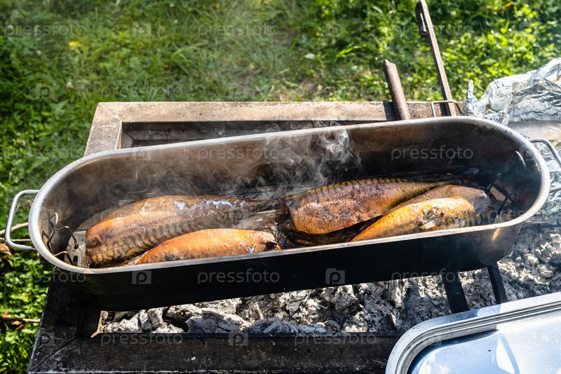 Свежекопченая рыба в коптильне на горячем гриле