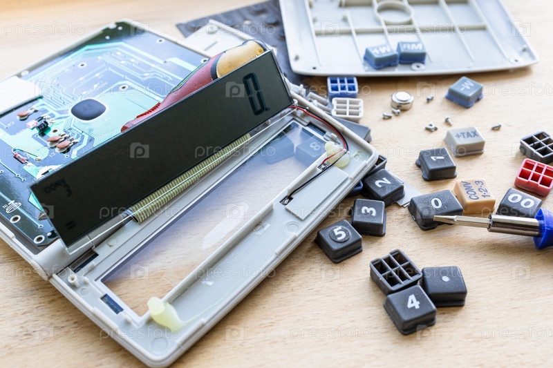 Ремонт жидкокристаллического калькулятора в разобранном виде крупным планом