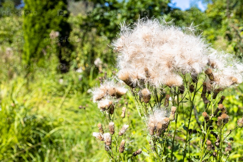 Пушистые семена чертополоха на растении крупным планом летом