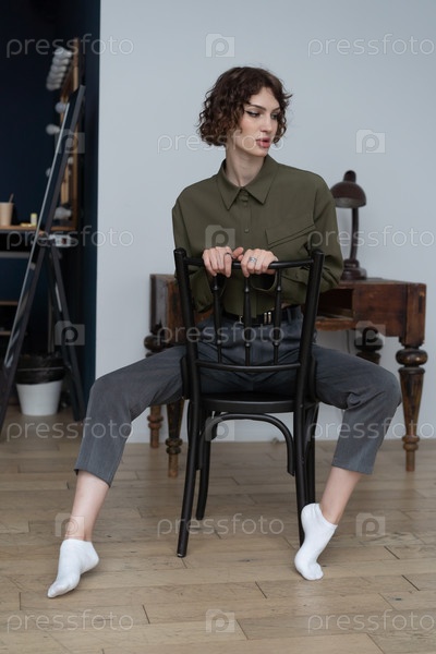Молодая красивая женщина сидит на стуле в зеленой рубашке в студии