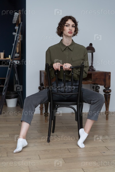 Молодая красивая женщина сидит на стуле в зеленой рубашке в студии