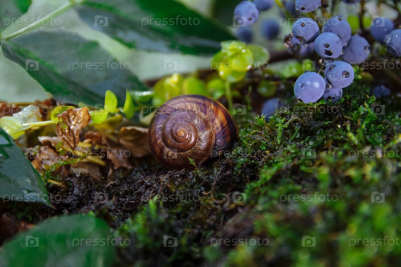 Большая коричневая улитка в раковине на поляне с зеленым мхом и листьями рядом с голубыми ягодами Махони, крупным планом черники и годубика, концепция макрокосма, дикая природа, вредители, макроискусство, лесные жители