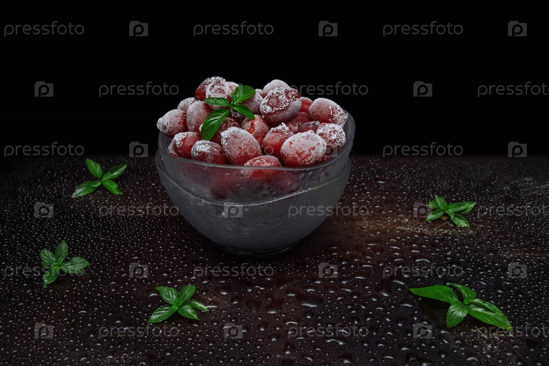 Красные и спелые замороженные ягоды кизила с зелеными листьями мяты в стеклянной миске на столе с каплями воды на темном фоне крупным планом, концепция приготовления десертов, пирогов, смузи, сохранение витаминов